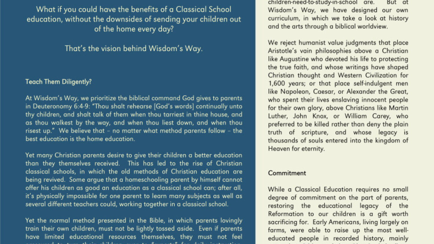 What if you could have the benefits of a Classical School education, without the downsides of sending your children out of the home, into a classroom setting, every day? That’s the vision behind Wisdom’s Way.